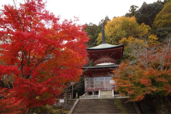 参道の階段や多宝塔周辺の紅葉が見どころ。