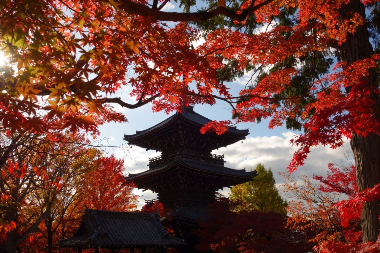 東福寺から山手に進んだ先にある今熊野観音寺は、多宝塔や弘法大師と紅葉のコラボレーションが見所。